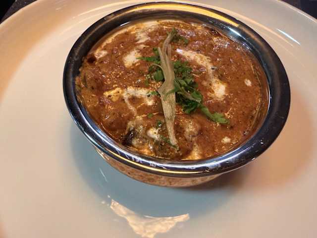 - Cubetti di paneer in una salsa ricca e cremosa di pomodoro, anacardi e spezie. Serviti con riso basmati