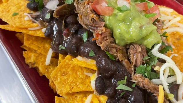 Tostones de plátanos coronados con pollo carne o queso y ensalada