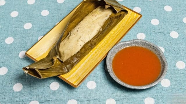 Masa de maiz rellena con una delciosa salsa y carne de gallina, envuelta en una hoja de plátano