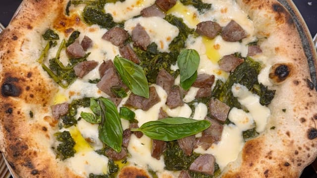 Disco di pasta doppia cottura, crema di friarielli, salsiccia paesana, stracciata di bufala, parmigiano reggiano 20 mesi, basilico fresco, olio EVO DOP