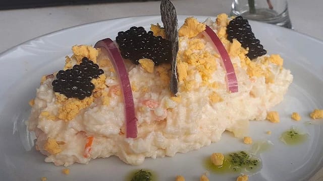 Con patatas, zanahoria, huevos, mayonesa y gambones