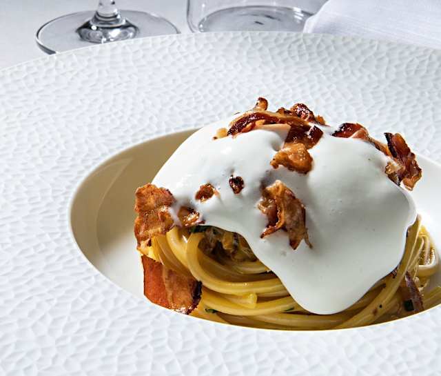 - Panettone tostato, zucca e castagna, bresaola, misticanza selezionata con finocchio e arancia, yogurt e cereali, crème brûlée
