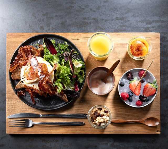 - Pane ai cereali, confettura di mirtilli, uovo all’occhio di fattoria, bacon croccante, misticanza selezionata, yogurt e cereali, crème brûlée