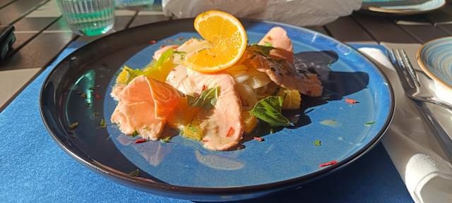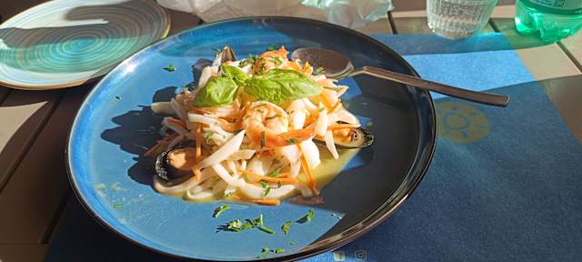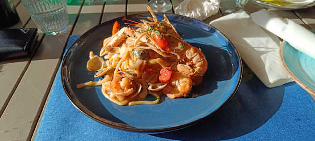 9/10The little restaurant at the waterfront has a few tables outside which offer a nice view over the Pyrgo beach. Very pleasant that traffic in the street in front is very limited - quiet! We love it. Food was excellent and we liked that some dishes are off the beaten track; e.g. the starter crostini cicoria con alici e buratta - very, very delicious! Portion sizes are generous. Limited choice of wine, but good, and at a fair price. Desert (millefoglie) and coffee excellent. Service very friendly and helpful. Thank you. And yes, we will definitely come again.