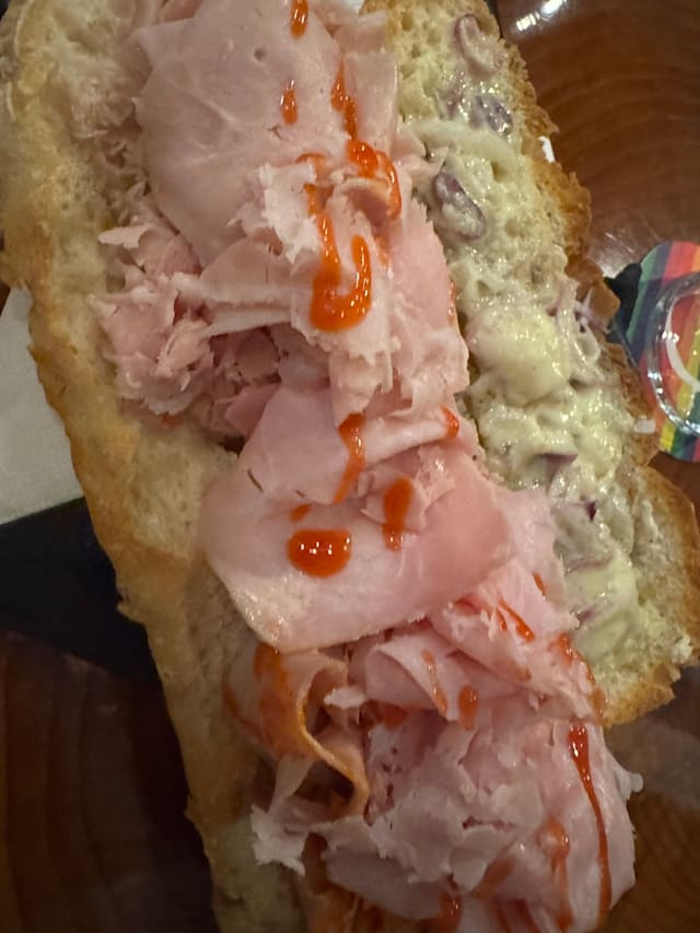 Polvere di pepe nero, origano, cipolla rossa di tropea IGP affogati nella provola affumicata, prosciutto cotto alta qualità e salsa Sriracha