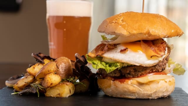 250 gr di carne, formaggio, lattuga, pomodori, pancetta nostrana, uovo al tegamino, ketchup e maionese