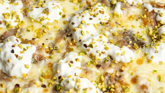 Base bianca, mozzarella fiordilatte, mortadela trufada, fonde de parmesano, lluvia de pistacho