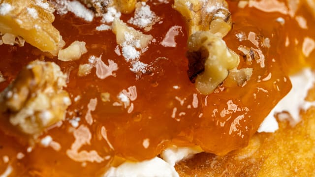 Preparado con dados de manzana verde, nueces, rulo de cabra y aderezado con una miel mostaza silvestre