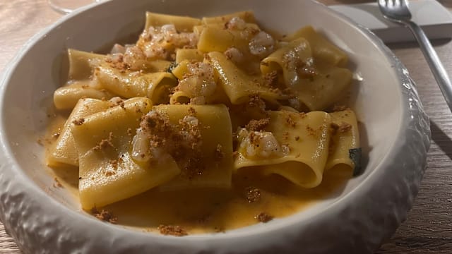 Linguina, passata di datterino giallo, scampi e bottarga di tonno
