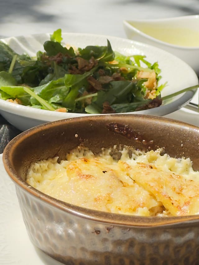 Ravioles fraîches aux cépes gratinées, servies avec une crème de parmesan a la truffe.