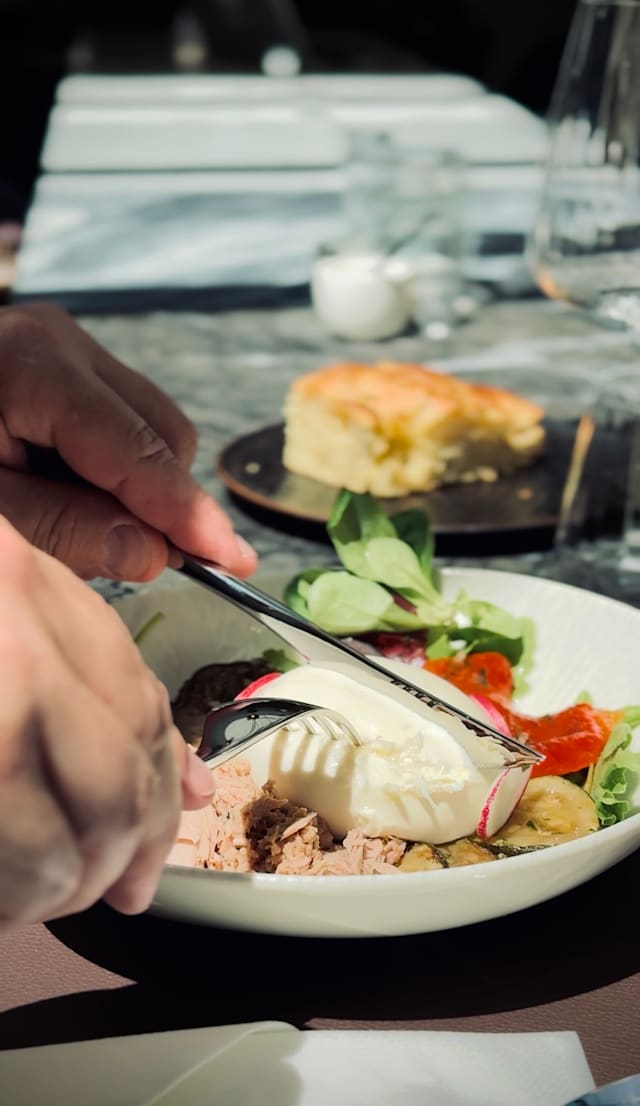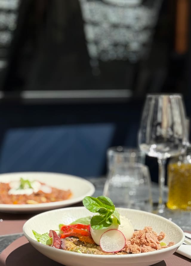 Mesclun, légumes grillés, burrata et pesto. Au choix : al tonno - thon émietté / al prosciutto - jambon italien