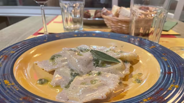 - Pici al pesto di pistacchio con gocce di burrata e guanciale croccante