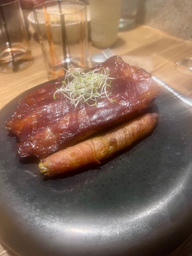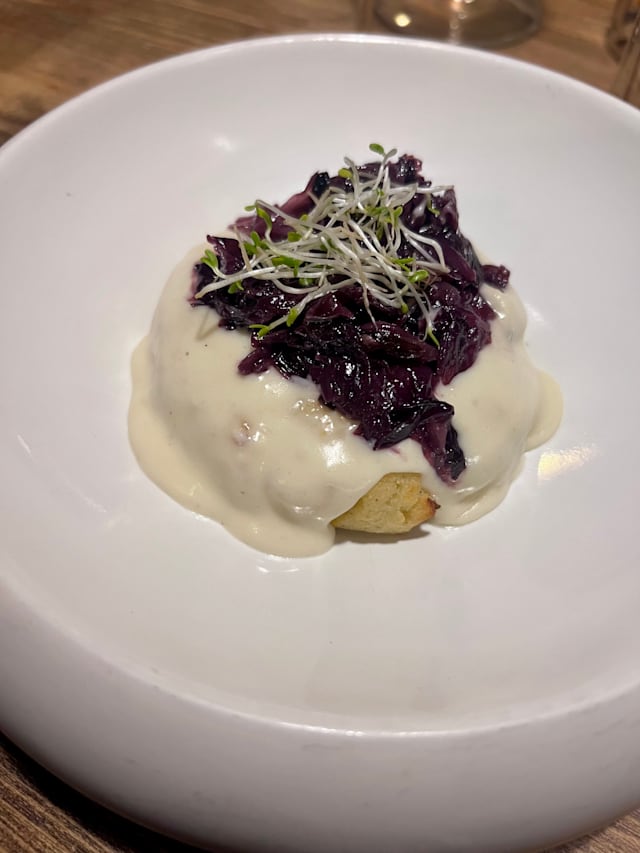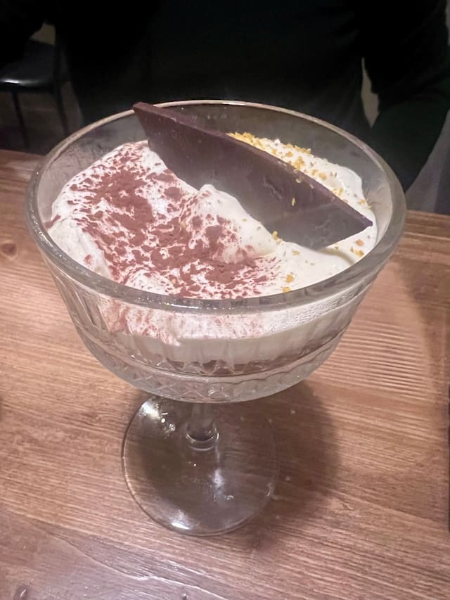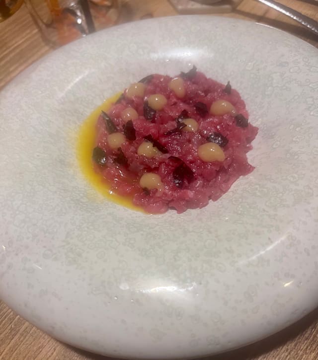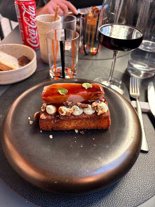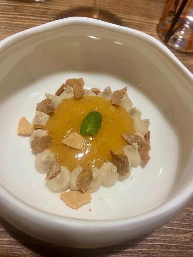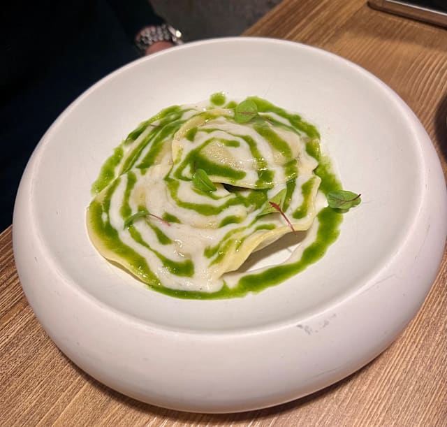 7/10+1Food looks fancy and the menu is inventive. However, the taste is just okay. Pork belly and confit duck dish were both drier than I would have liked for those prices. They had a play on carbonara egg dish that was a bit too salty. Specialty mussel pasta tasted good, but the mussels were tiny and very few. Tiramisu was not balanced between the cream/ladyfingers and the coffee/alcohol. Other items we sampled (eggplant Lasagne-like dish, raviolo, mackerel dish, demonstrated cheesecake) tasted good but nothing special.