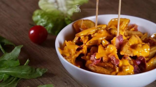 Hamburger 170g di marchigiana, provola, melanzane a funghetto, crocchè artigianale, fonduta di fontina