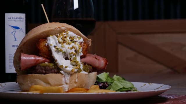 Hamburger 170g di marchigiana, pistacchio, bacon, pomodoro secco, burrata