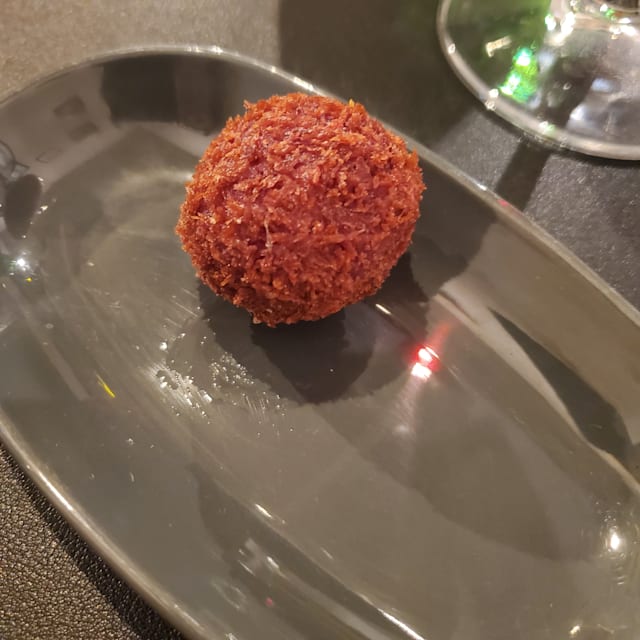 Guancia brasata con salsa di soia,whisky e purea di patata viola