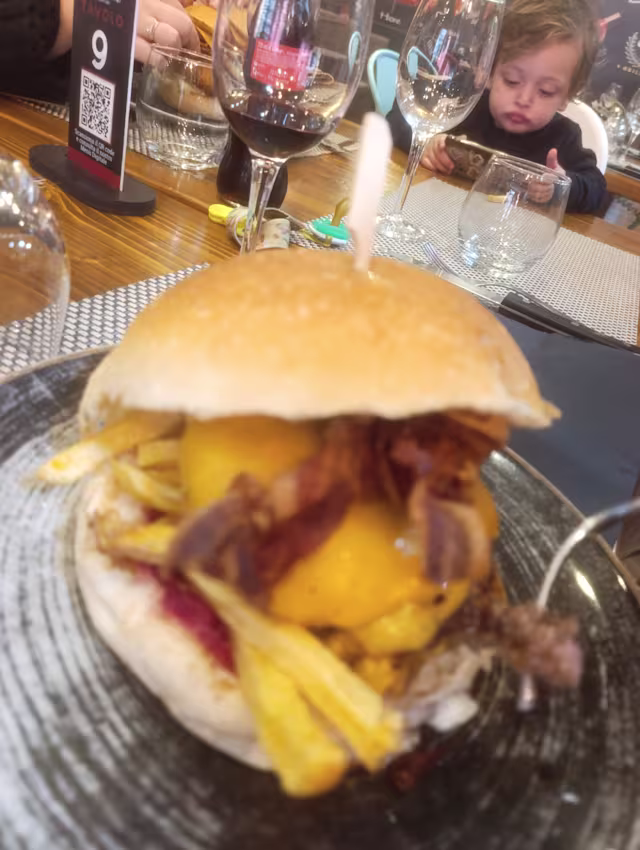 - Hamburger di scottona 200gr, cheddar fuso, insalata iceberg, maionese, salsa BBQ, pomodoro di sorrento, cipolla caramellata, bacon croccante
