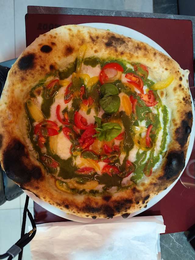 - Una pizza fresca e gustosa grazie all'unione del filante fior di latte campano, pomodori gialli, pesto di rucola, e il cotto artigianale che avvolge una cremosa burrata pugliese