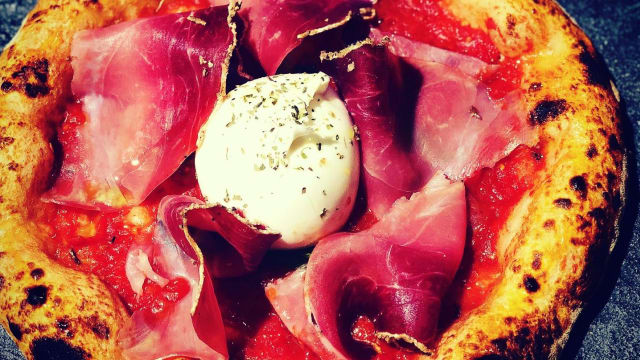 Una pizza fresca e gustosa grazie all'unione del filante fior di latte campano, pomodori gialli, pesto di rucola, e il cotto artigianale che avvolge una cremosa burrata pugliese