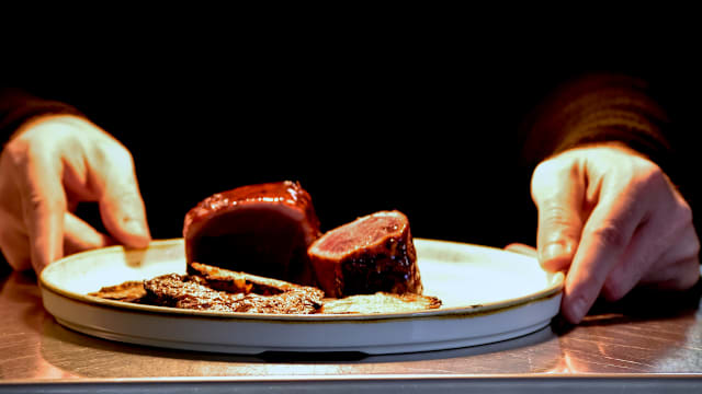 Trancio di tonno rosso al rub, nappato in salsa barbecue, servito con patata schiacciata croccante
