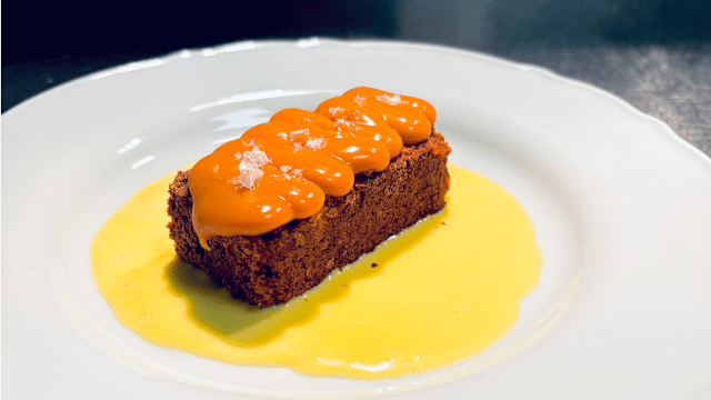 Brownies al cioccolato, salsa mou, sale maldon e crema inglese all'amaretto