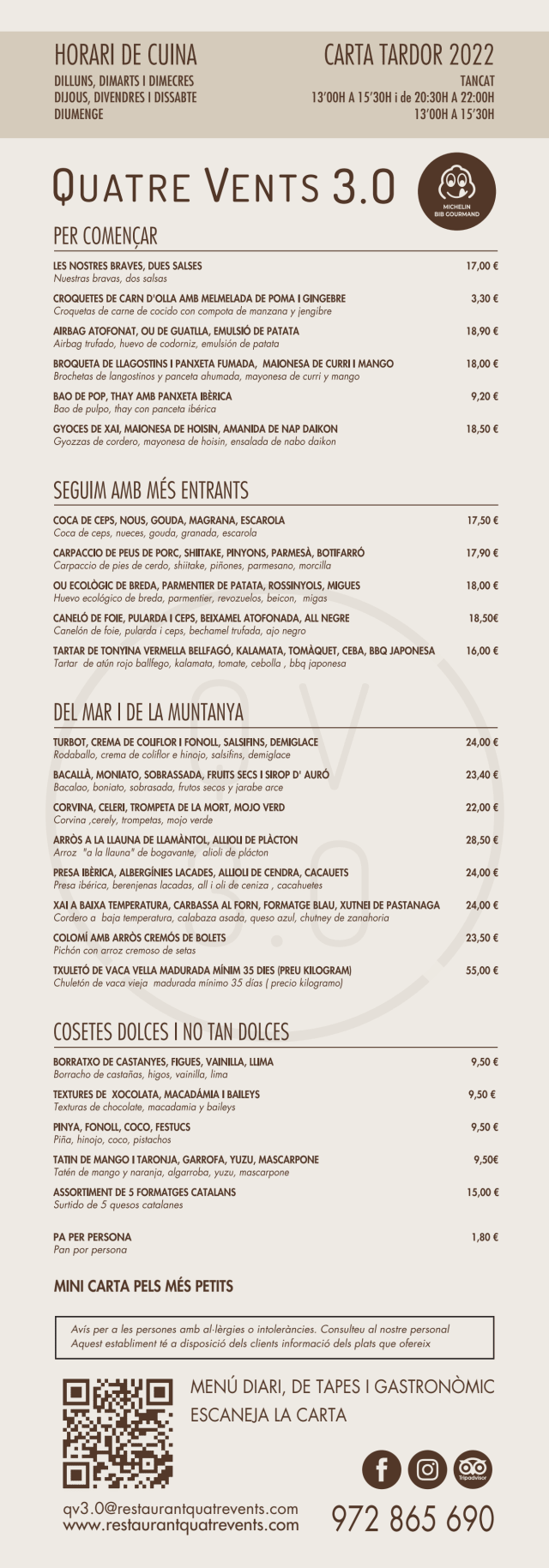 10/10This was our 3rd time eating at Quatre Vents. It is a favorite stop for us on the way from Barcelona to the Girona area. Excellent, creative food at very reasonable prices and within an attractive, modern setting. Highly recommend!