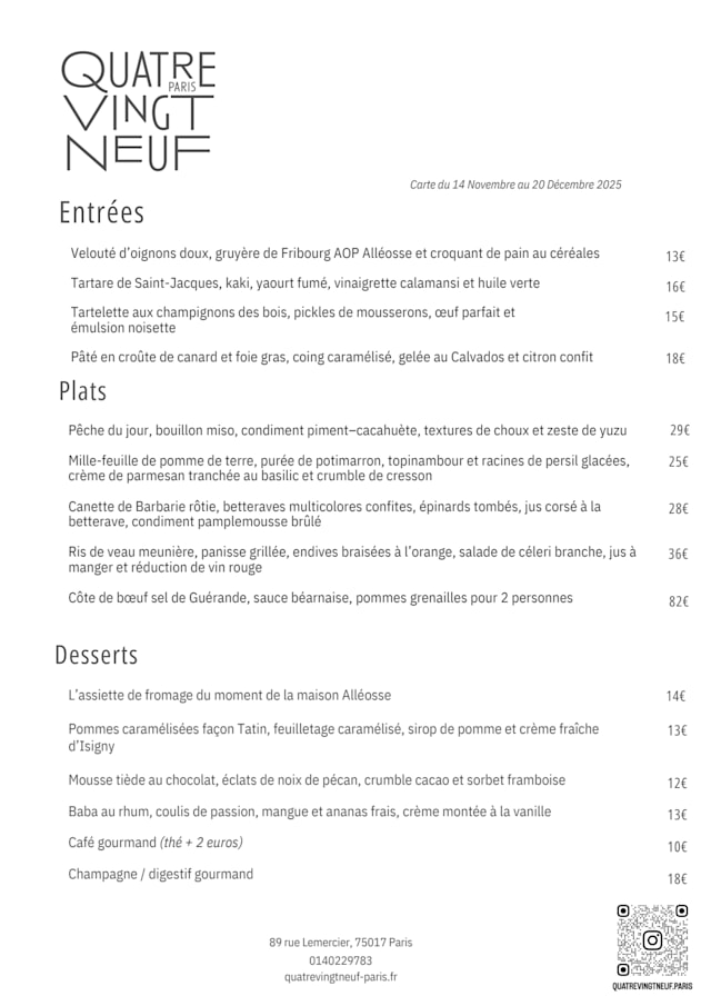 Hello Guillaume M., Thank you very much for your kind feedback following your stay at the Quatre Vingt Neuf (89). All the team is happy to learn that you liked the cosy atmosphere of our establishment and that you enjoyed our seasonal French cuisine. See you soon in Batignolles ? QVN Team