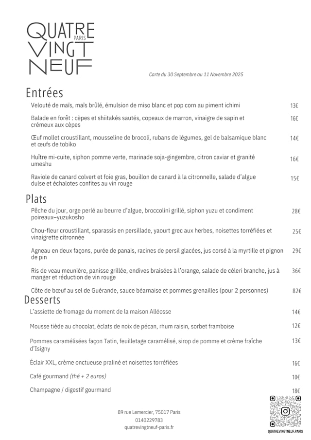 9.5/10We found Quatre Vingt Neuf via the Fork, otherwise would never have found this small and excellent restaurant. Menu with limited choice but very fresh ingredients in a nice neighbourhood. We definitely can recommend and appreciate also the reasonable prices.