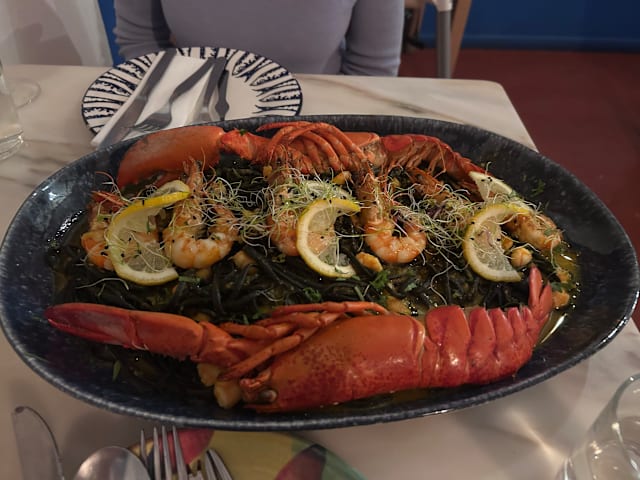 10/10I happened to walk past this little restaurant while wandering around Lisbon. It’s off the main street and is a hidden gem. They were not yet open for dinner but the door was open and they were prepping for dinner. I was able to make a reservation online for dinner. There were only about 8 tables and 1 server, but he was welcoming and happy to help us pick out a bottle of wine and select entrees. We started with a lightly seared tuna appetizer with pickled onions and tomatoes that was super flavorful. I then enjoyed the sea bream and other guests had the seafood paella and seafood lasagna. Everything was delicious.