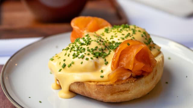 Bagel de sementes de papoila, cream cheese, salmão curado na casa, salsa em conserva, rúcula, funcho, courgette e molho de laranja