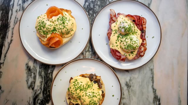 Bagel de sementes de papoila, creme de abacate, rúcula, bacon, ovo estrelado e flocos de chili