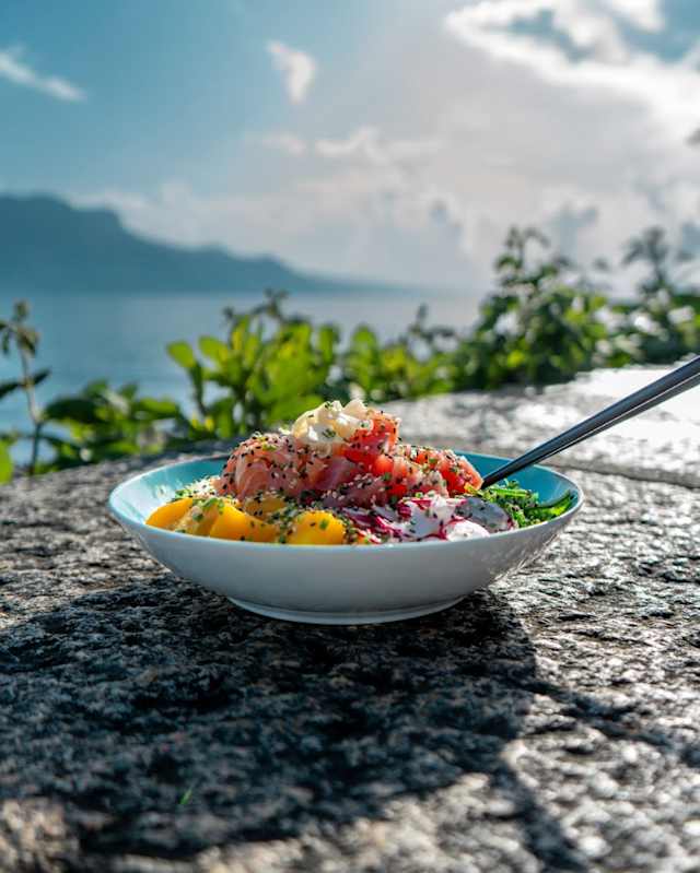 - Tataki de thon rouge mi-cuit avec sésame, guacamole maison, algues wakame, mayo-kimchy, et shishimi tagarashi