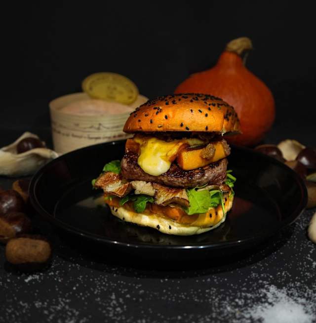 - Bœuf 160gr, bacon, chèvre, œuf, noix, salade et confiture d'abricots du valais