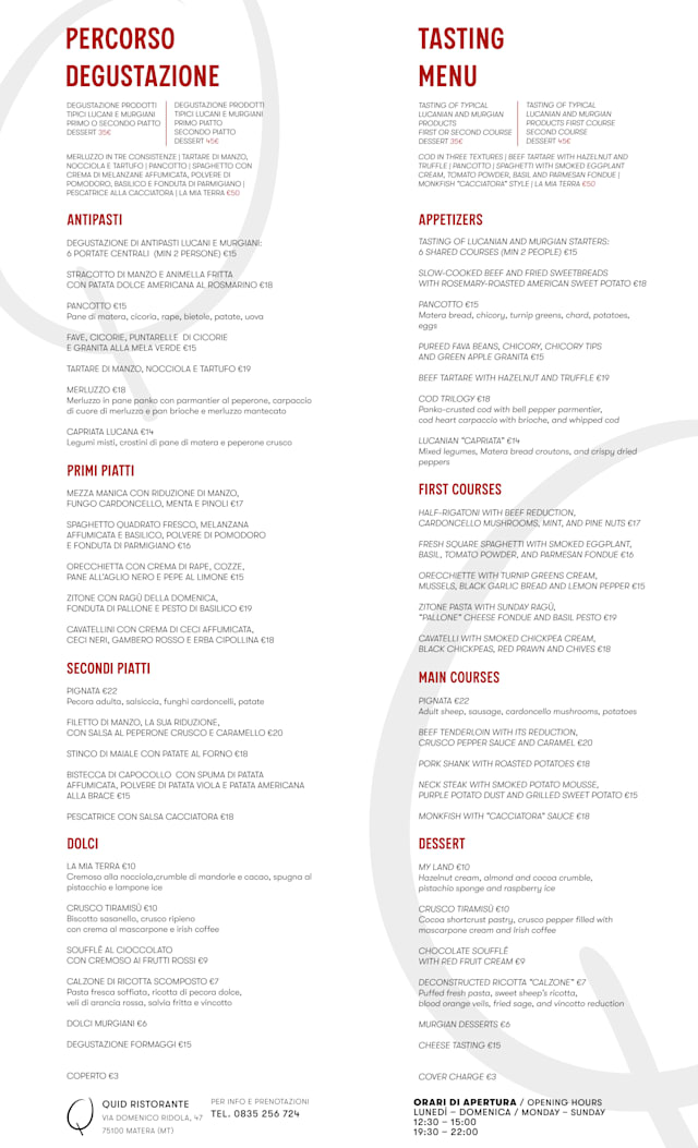 10/10What a lovely surprise. We went for a little sightseeing in Matera and before we went I did a little research. We wanted high quality food prepared lovingly with a twist. We wanted to eat outdoors with a view and somewhere that was dog friendly. This restaurant hit every mark and then some. My husband who is a professional chef and a hard person to impress was beyond happy. We had an exquisite meal and sampled dishes from appetizers to prime, second and desert, all were fabulous. The staff was attentive and trained well. What a treat! LUCKY US. We will be back.