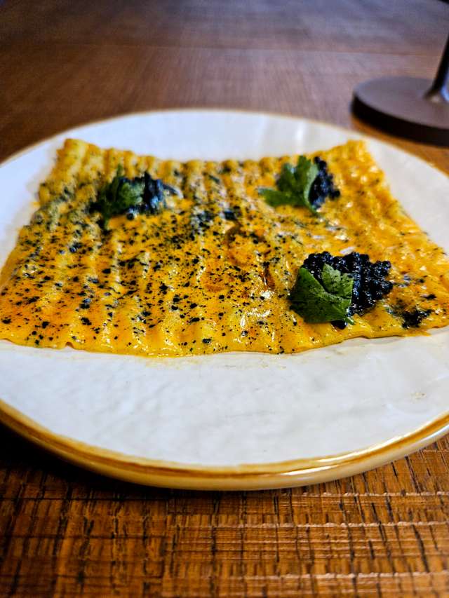 - Sfoglia ripiena di risotto allo zafferano, salsa allo zafferano e insalatina mizuna