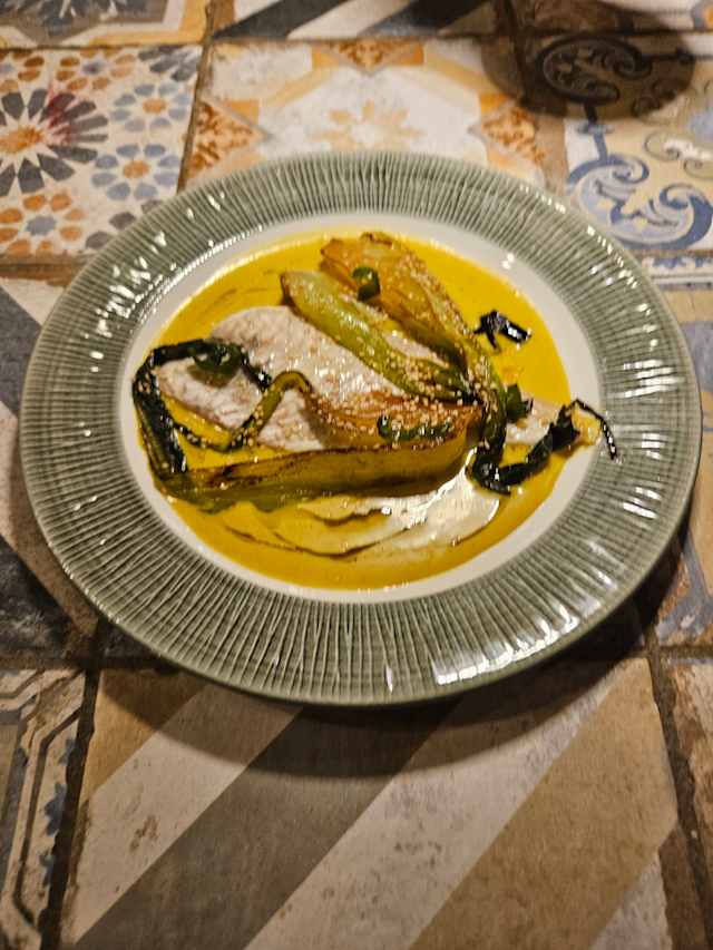 - Coda di rospo avvolta in foglie di porro, crema di cardi, lenticchie beluga e biete al limone