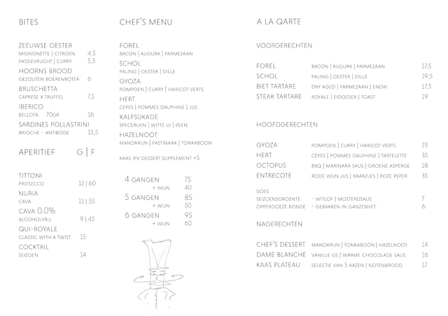Onze chef Quirijn Bakker heeft op jonge leeftijd ervaring op gedaan in verschillende luxe restaurants. Hier heeft hij zijn eigen visie kunnen ontwikkelen dat zich uit in een eigenzinnige, maar bovenal creatieve stijl.