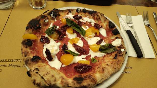 - Passata di pomodoro, fiordilatte, funghi champignon, prosciutto cotto, carciofi, olive taggiasche