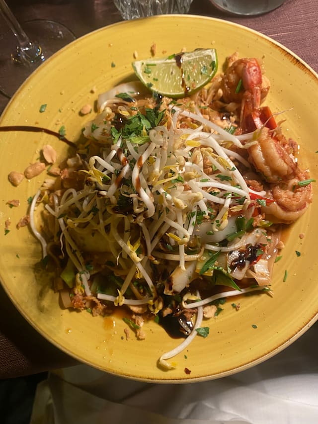 Tagliatelle di riso con cavolo cinese, arachidi, salsa tamari e gamberi