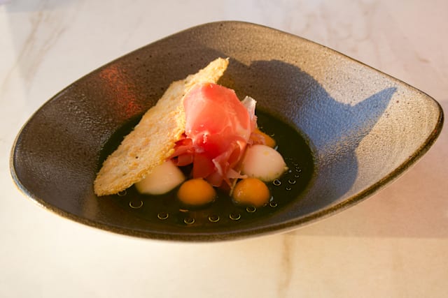 - Melon et jambon de parme, jus de basilic, tuiles de parmesan et mozzarella