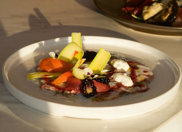 - Carpaccio de poulpe et courgettes violon, nectarines rôties, stracciatella et vinaigrette de mûres