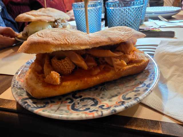 - Panino con maialino al forno formaggio filante, lattughina condita salsa demi glass