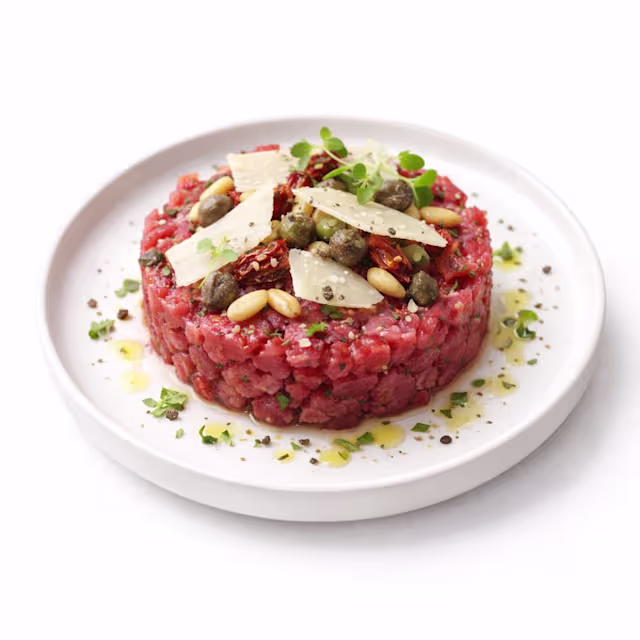 - Filet de boeuf en tagliata grillée à la florentine,servie avecroquette etcopeaux de parmesan.