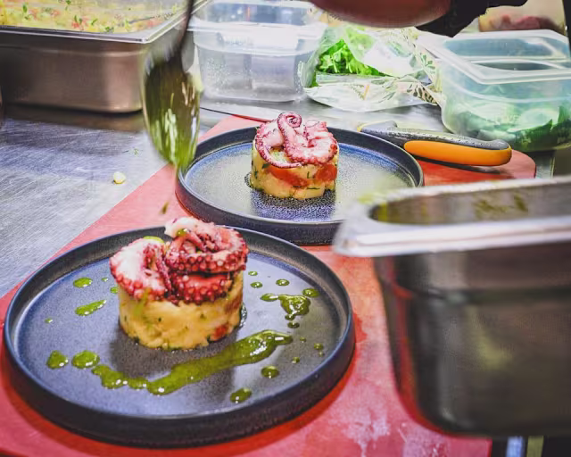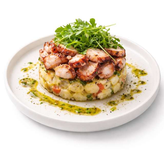 - Poulpe cuit à basse température. Mélange de céleri, tomates cerises, pomme de terre et persil frais, assaisonné d’huile d’olive extra vierge,citron et fleur de sel.