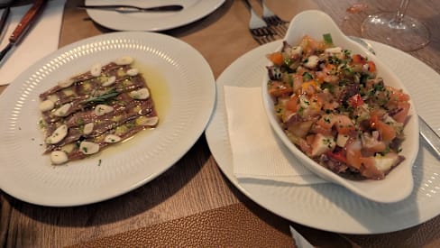 7.5/10nicely presented, tasted good, large portions. the back room was a bit dark and loud which impacted the ambience unfortunately but we really enjoyed the food. we ordered the octopus salad and anchovies to start, which were all fresh and zesty. then we had the sea and land platter which was huge! we actually couldn't finish it all! I asked for the steak rare and it was extremely rare which I liked but my partner didn't so I'd recommended you ask for medium rare if that's your thing.