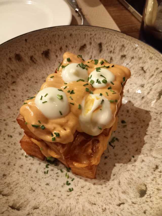 - Patatas fritas crujientes y huevos fritos, acompañados de virutas de jamón ibérico.