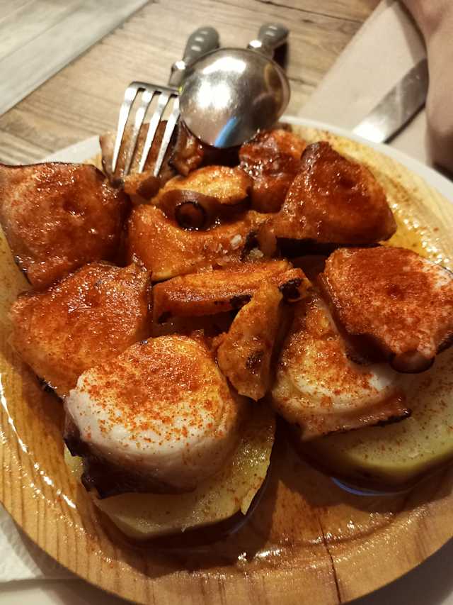 - Pulpo cocido y base de patas panadera, espolvoreado con pimentón y aceite de oliva, AOVE, el plato mas tradicional de Galicia