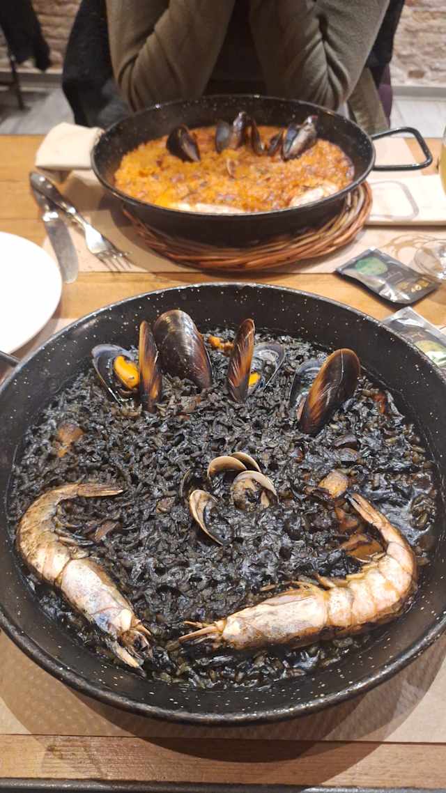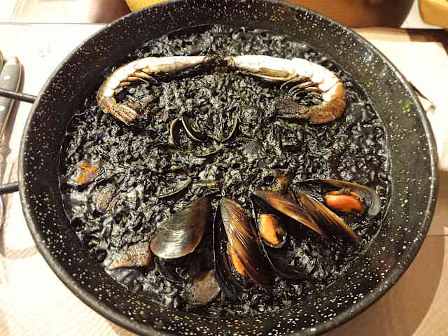 - Arroz negro cocinado con tinta de sepia, cebolla, ajo, pimiento y sepias troceadas.
