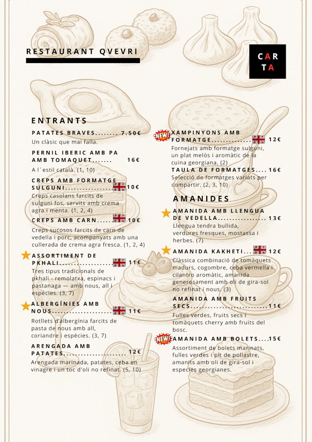 "QVEVRI – грузинский ресторан в Жироне Настоящие вкусы Грузии в самом сердце Жироны. Домашняя атмосфера, вино, напитки, хачапури, хинкали и другие блюда традиционной кухни. QVEVRI – restaurant georgià a Girona Els sabors autèntics de Geòrgia al cor de Girona. Ambient acollidor, vi, begudes, khachapu...