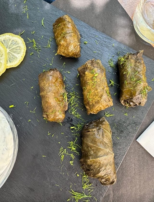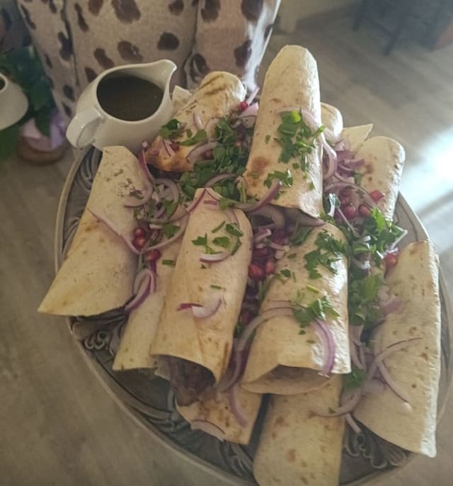 Rotllets d'alberginia farcits de pasta de nous amb all, coriandre i espècies.